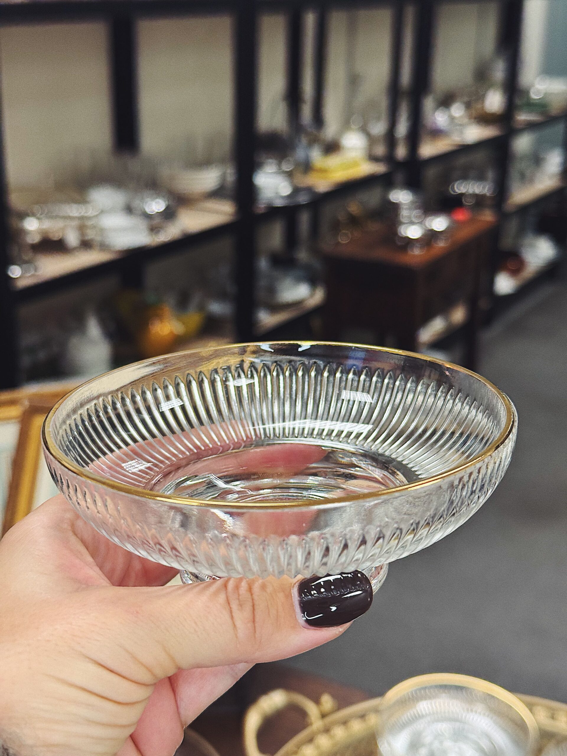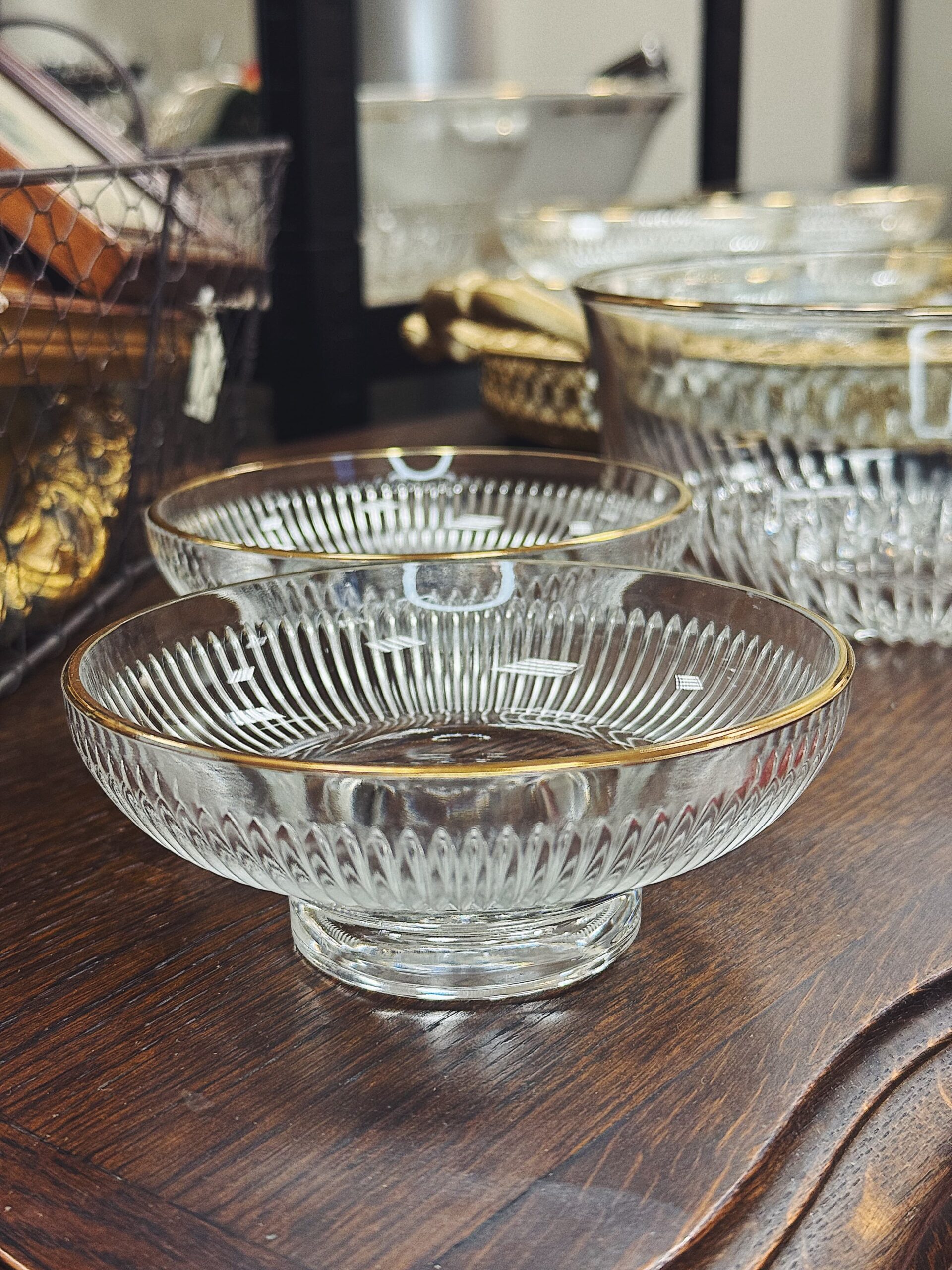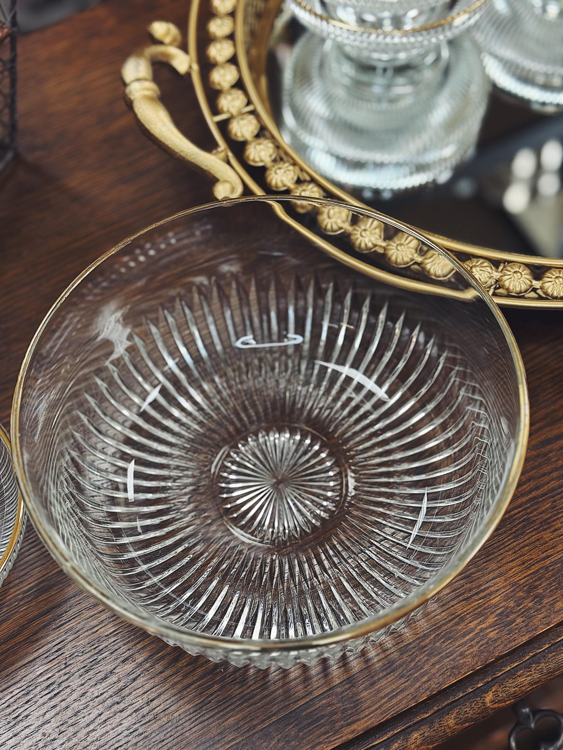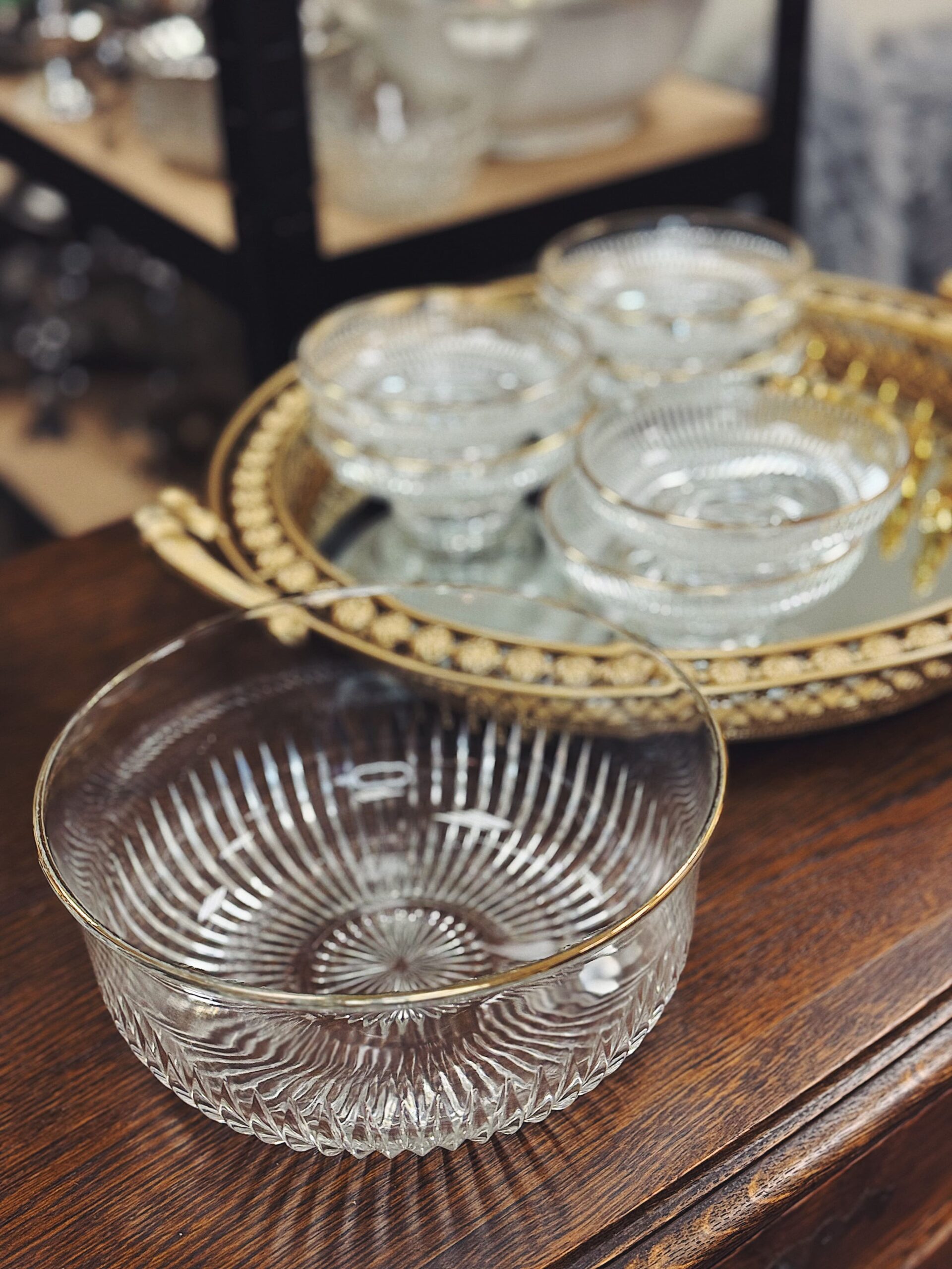 Elegantiškas prancūziškas „Reims France“ stiklo rinkinys – 6 dubenėliai ir 1 didesnis serviravimo indas. Pagaminta iš skaidraus presuoto stiklo su subtiliu raštu ir auksiniu krašteliu – klasikinis XX a. vidurio prancūziškas vintage stilius
