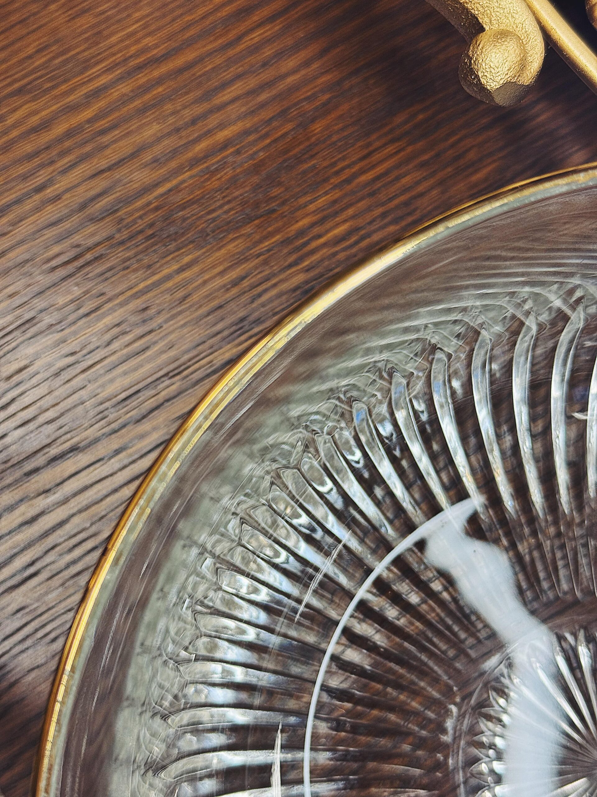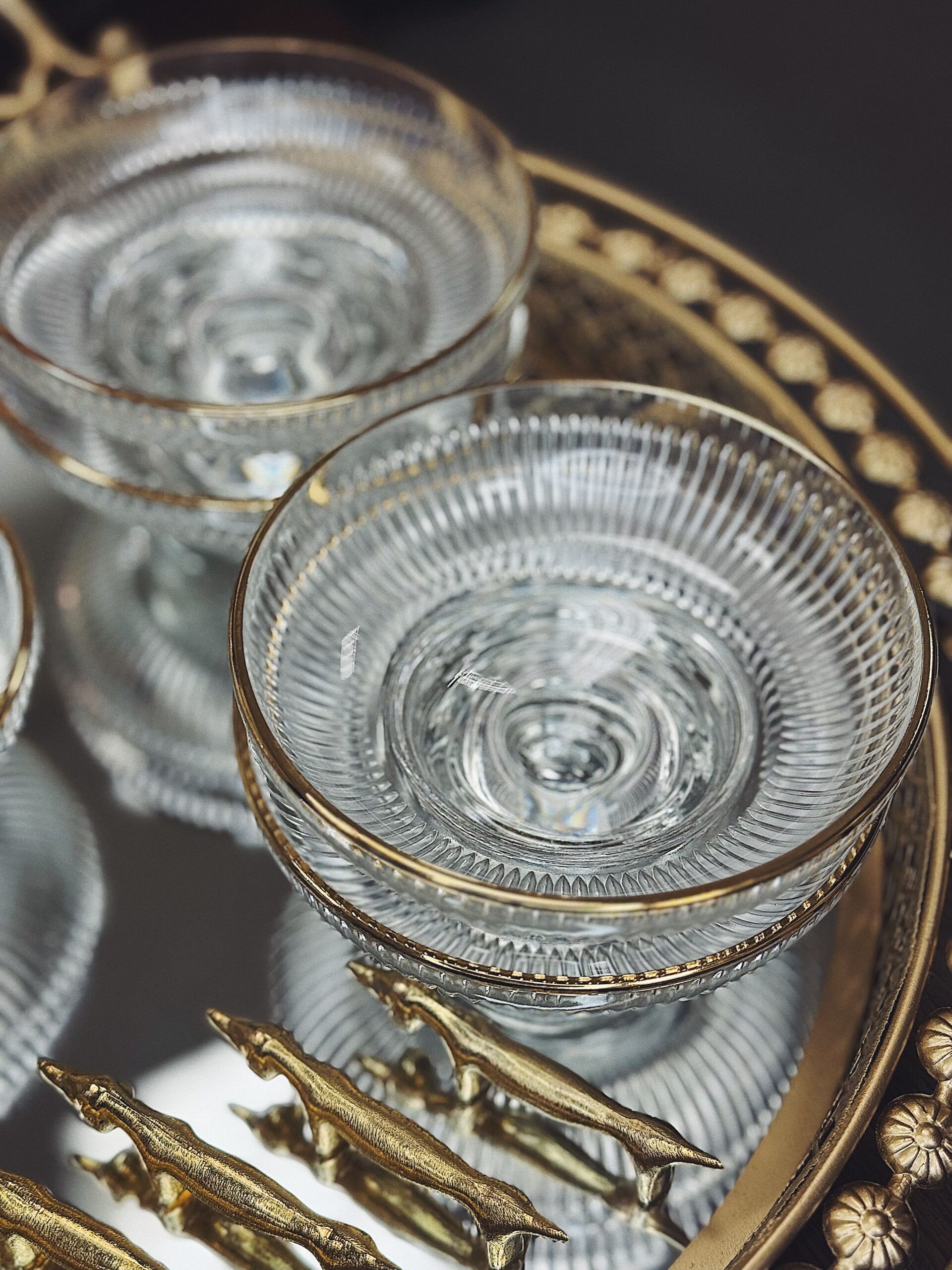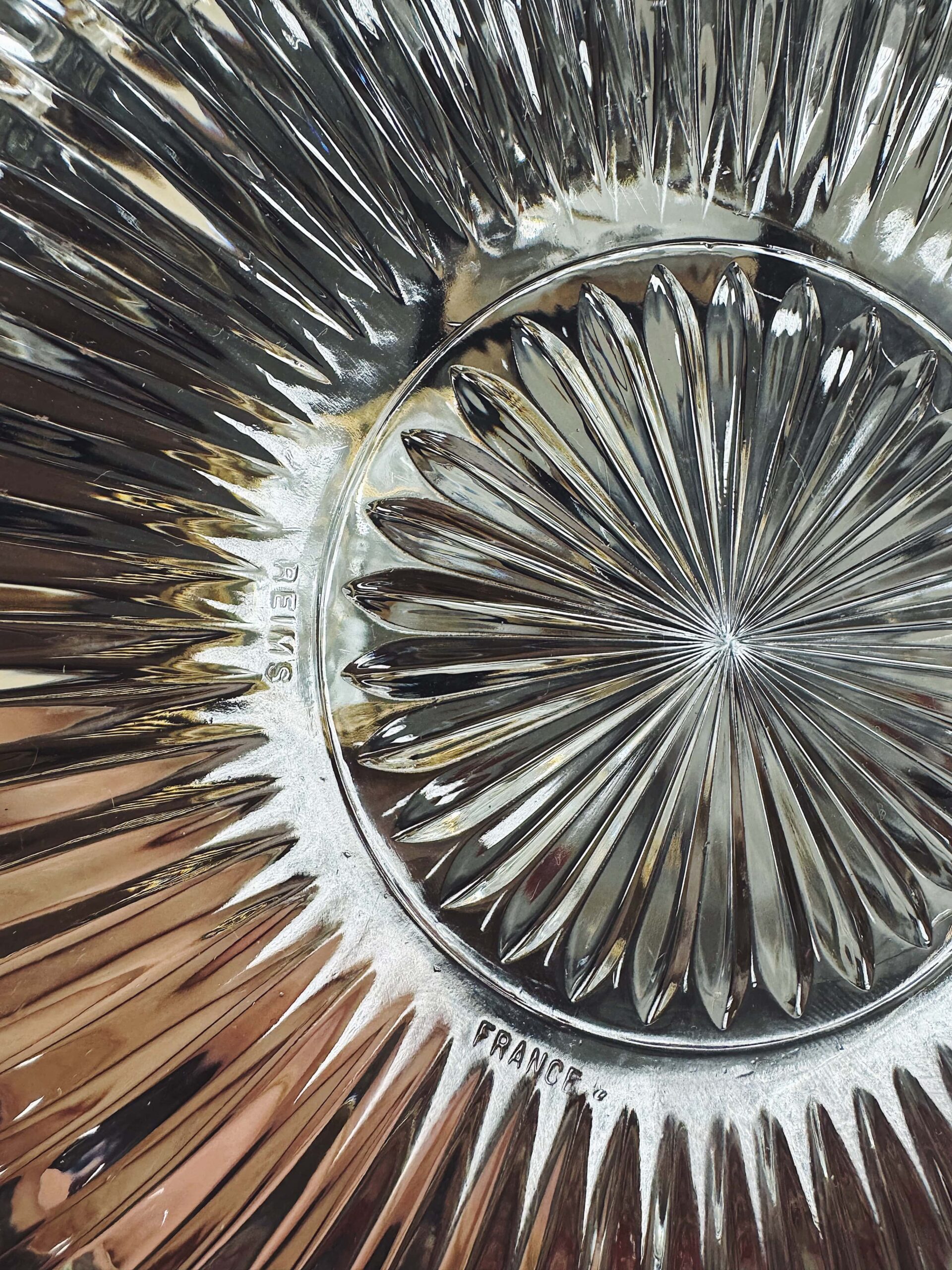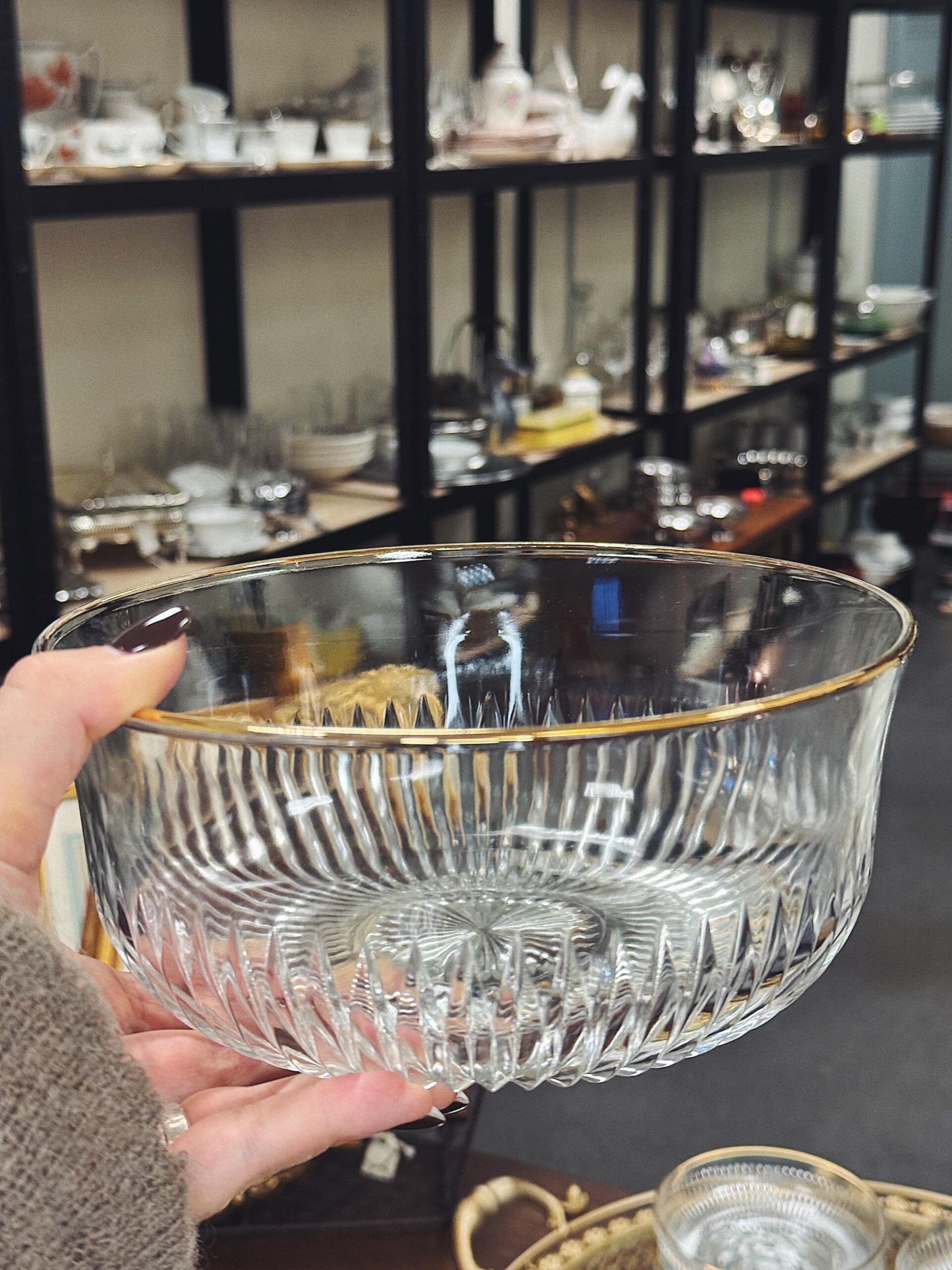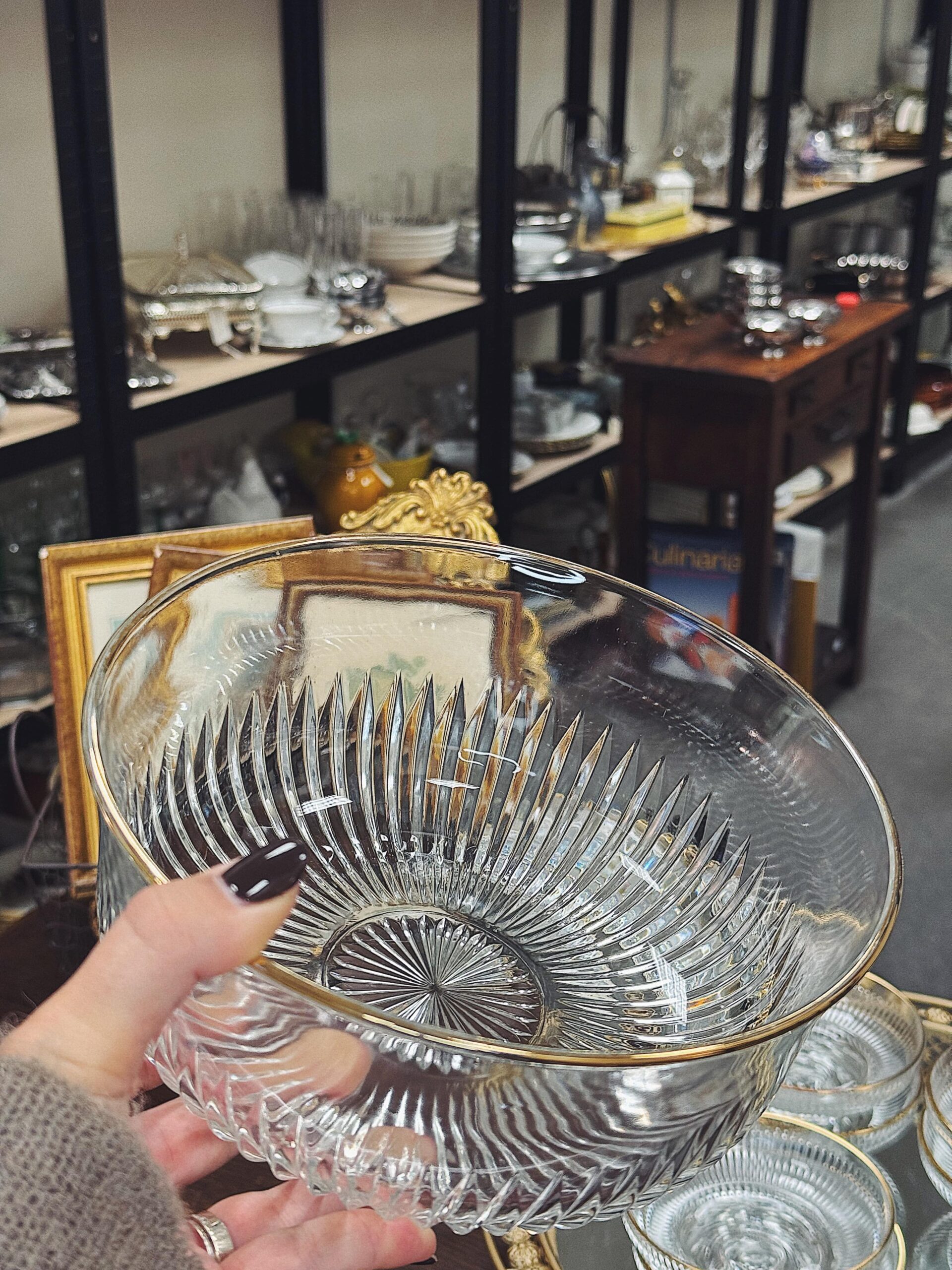 Elegantiškas prancūziškas „Reims France“ stiklo rinkinys – 6 dubenėliai ir 1 didesnis serviravimo indas. Pagaminta iš skaidraus presuoto stiklo su subtiliu raštu ir auksiniu krašteliu – klasikinis XX a. vidurio prancūziškas vintage stilius