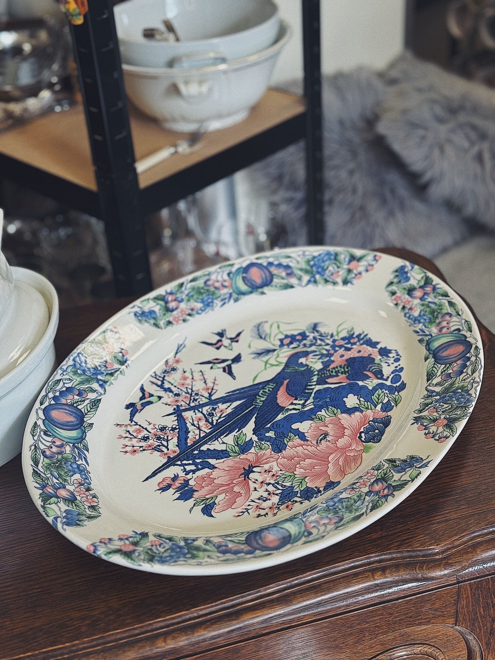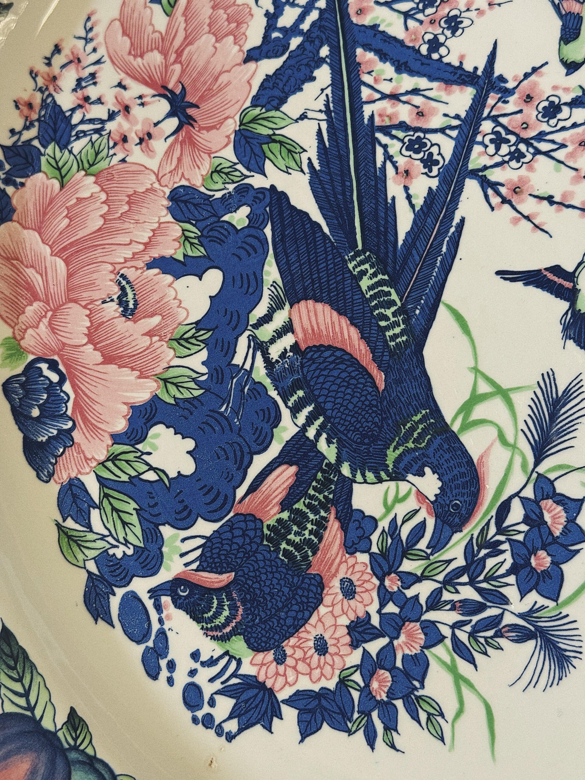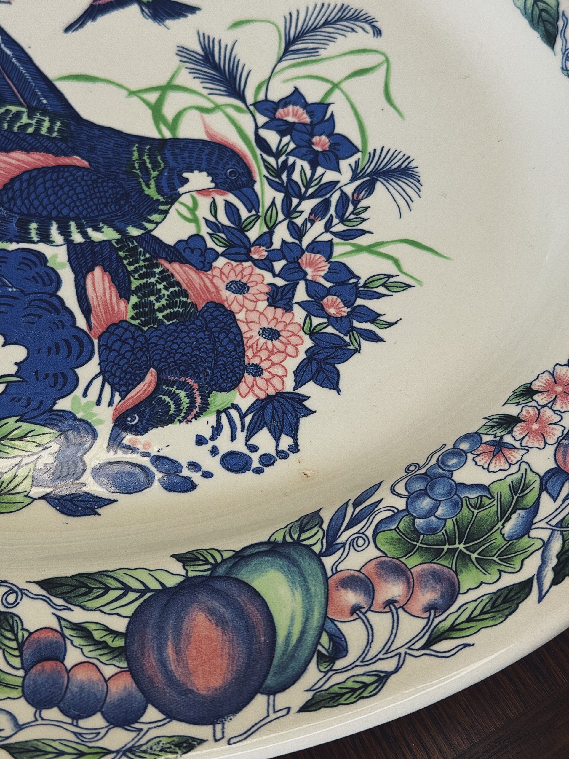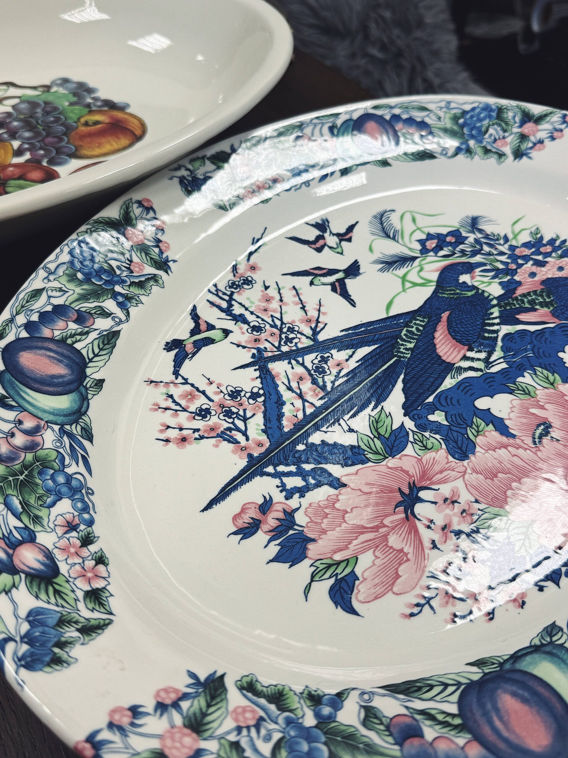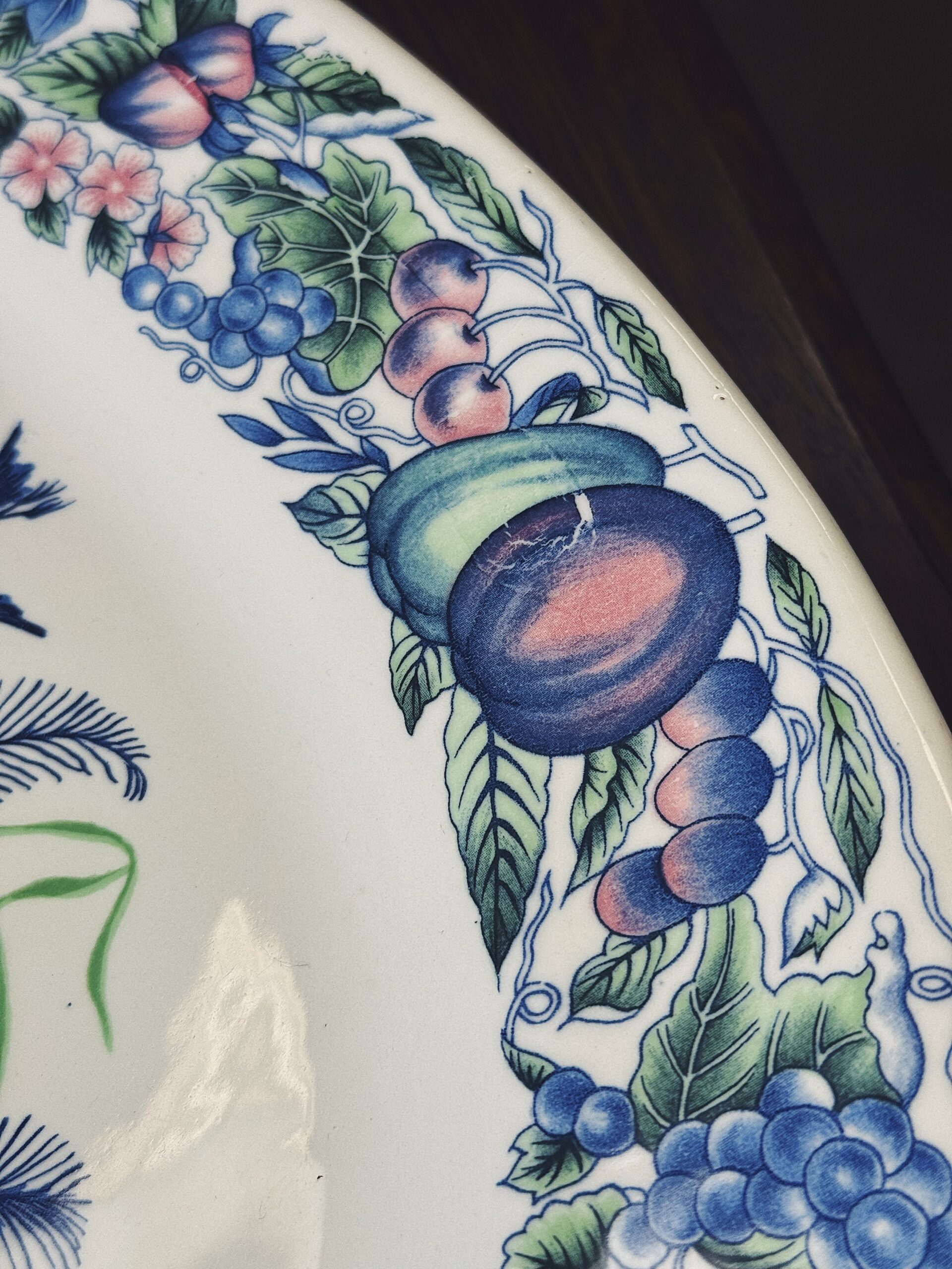 Įspūdingas itališkas serviravimo padėklas-lėkštė su sodria paukščių ir žydinčių šakų kompozicija. Klasikinis gėlių ir vaisių ornamentas rėmina centrinį piešinį su egzotiniais paukščiais, suteikdamas stalui elegancijos ir spalvingumo