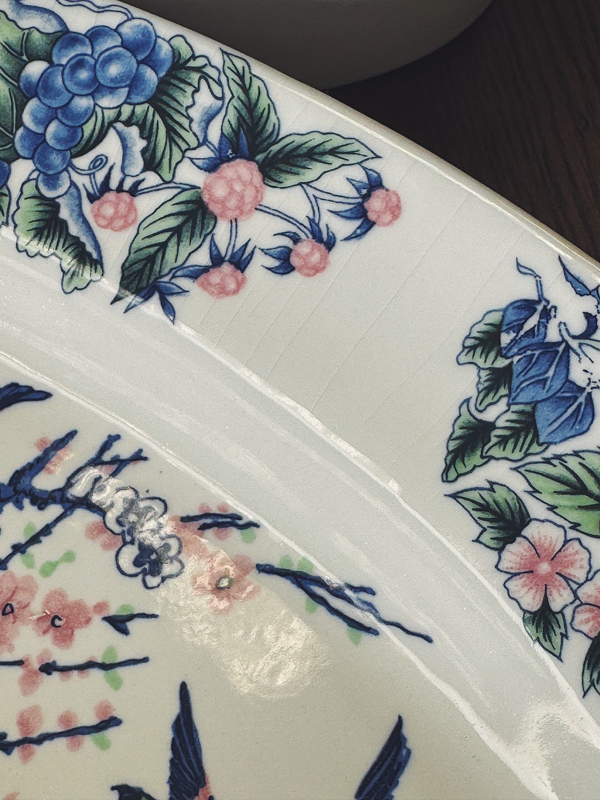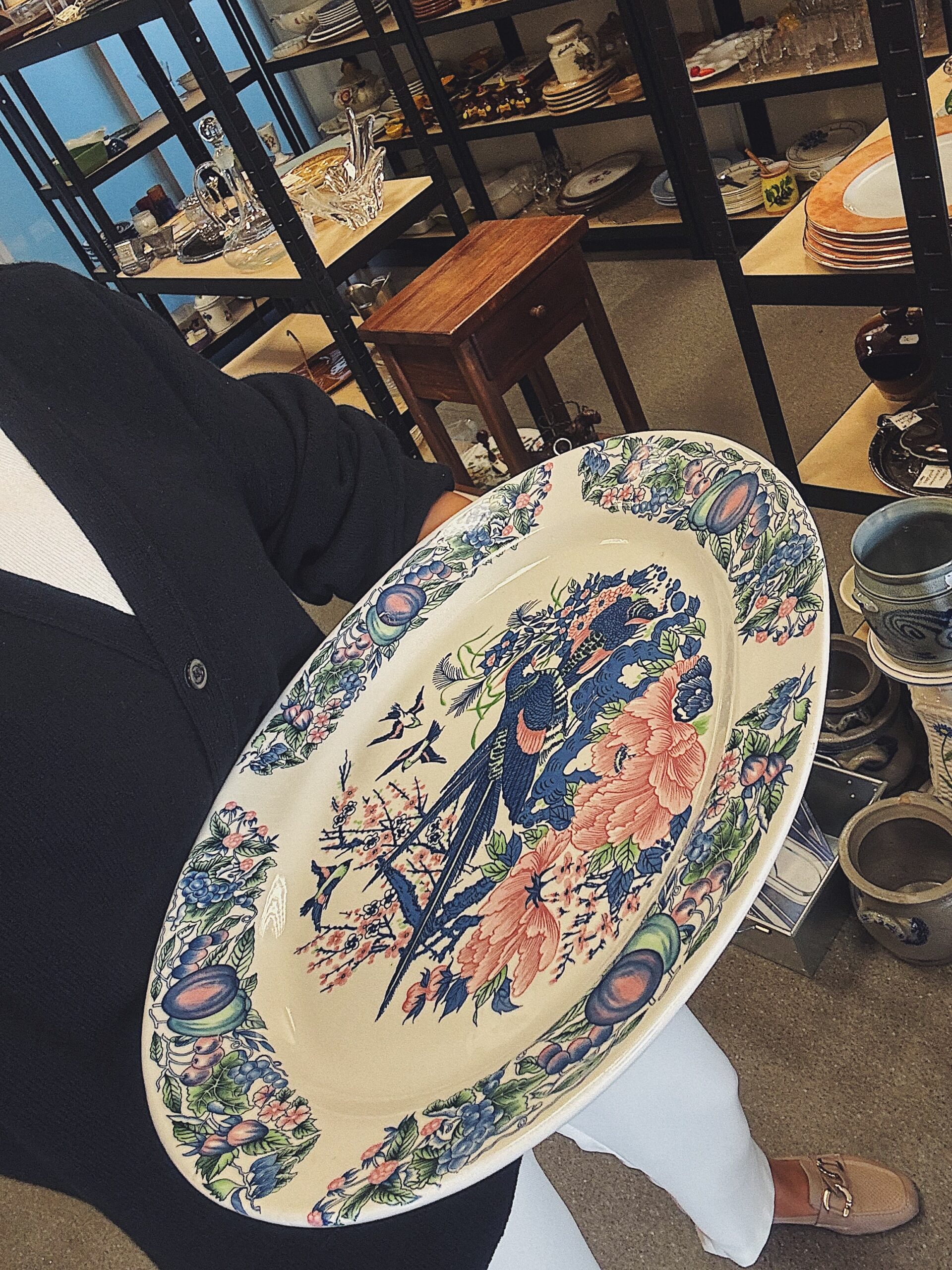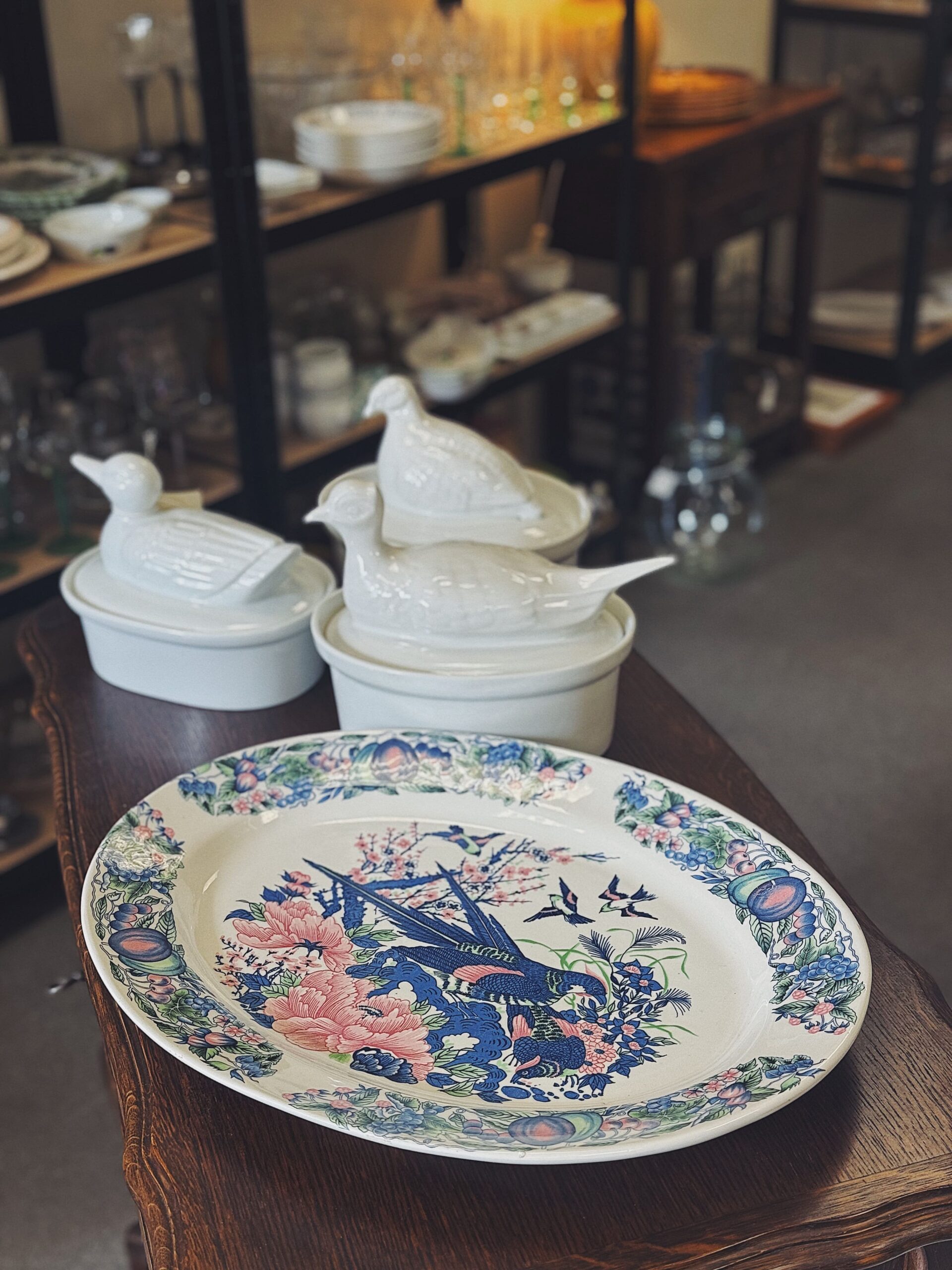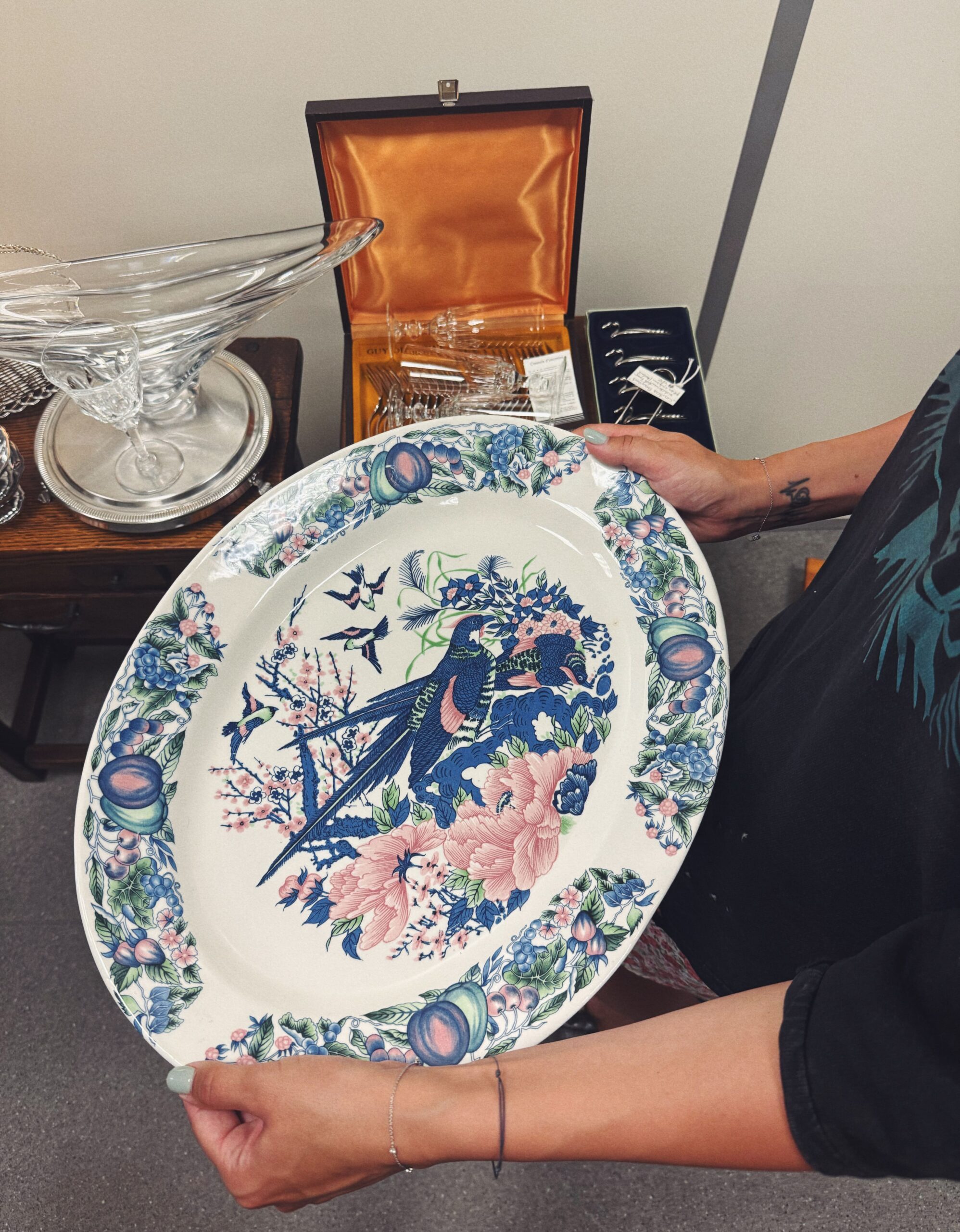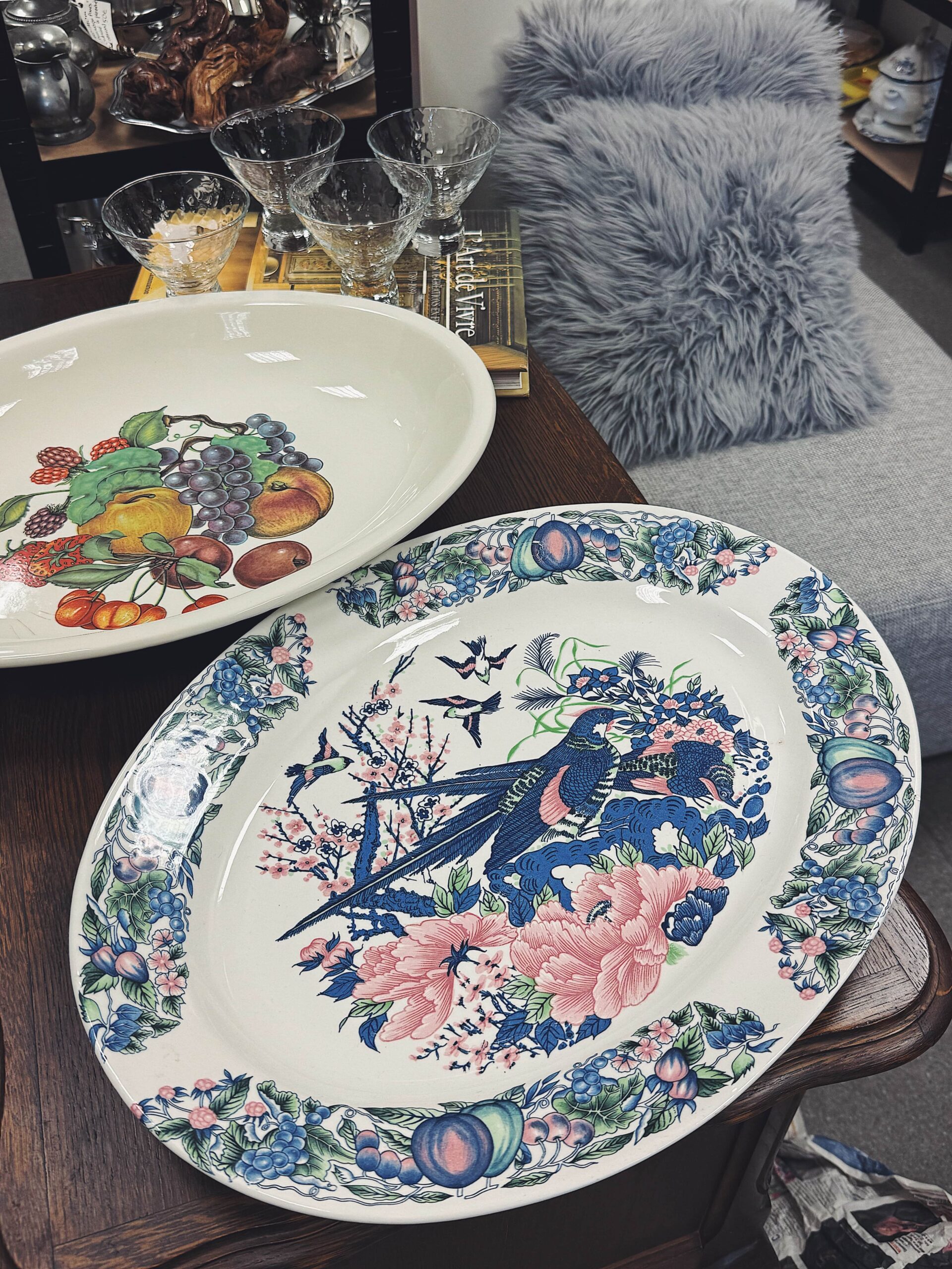 Įspūdingas itališkas serviravimo padėklas-lėkštė su sodria paukščių ir žydinčių šakų kompozicija. Klasikinis gėlių ir vaisių ornamentas rėmina centrinį piešinį su egzotiniais paukščiais, suteikdamas stalui elegancijos ir spalvingumo