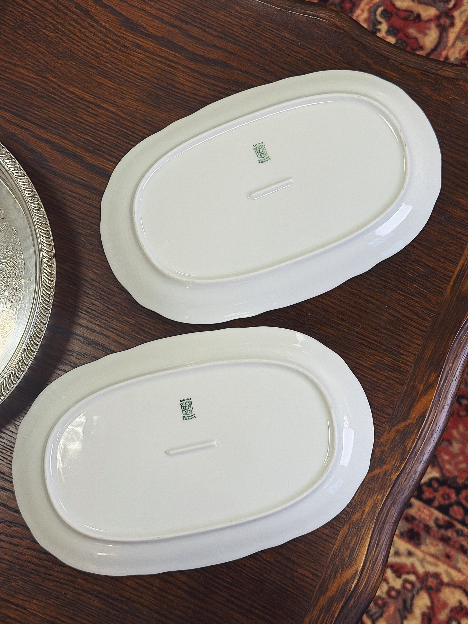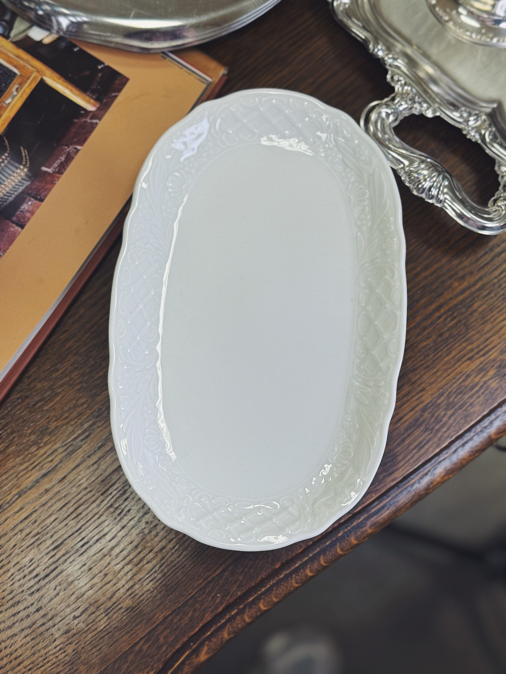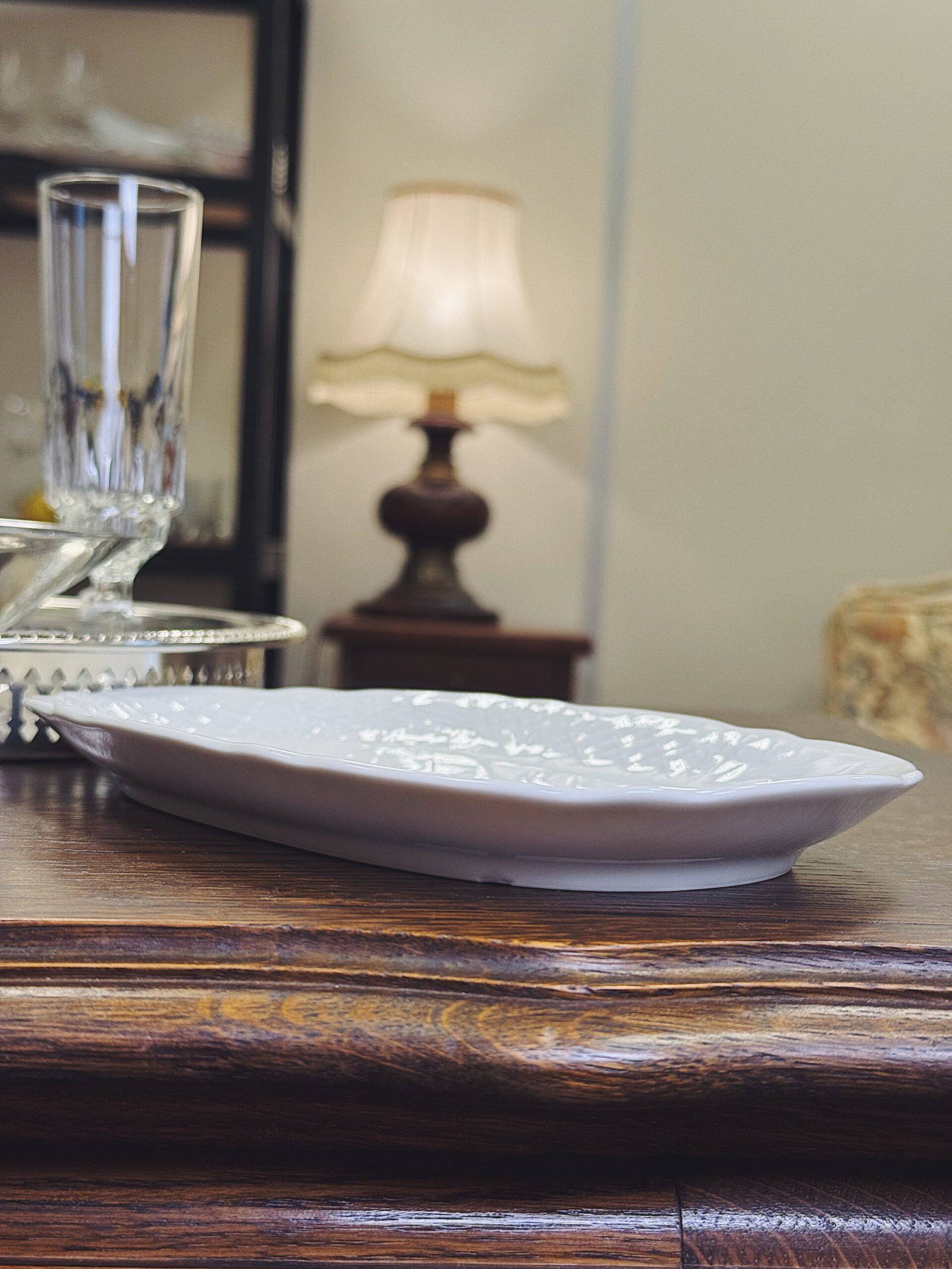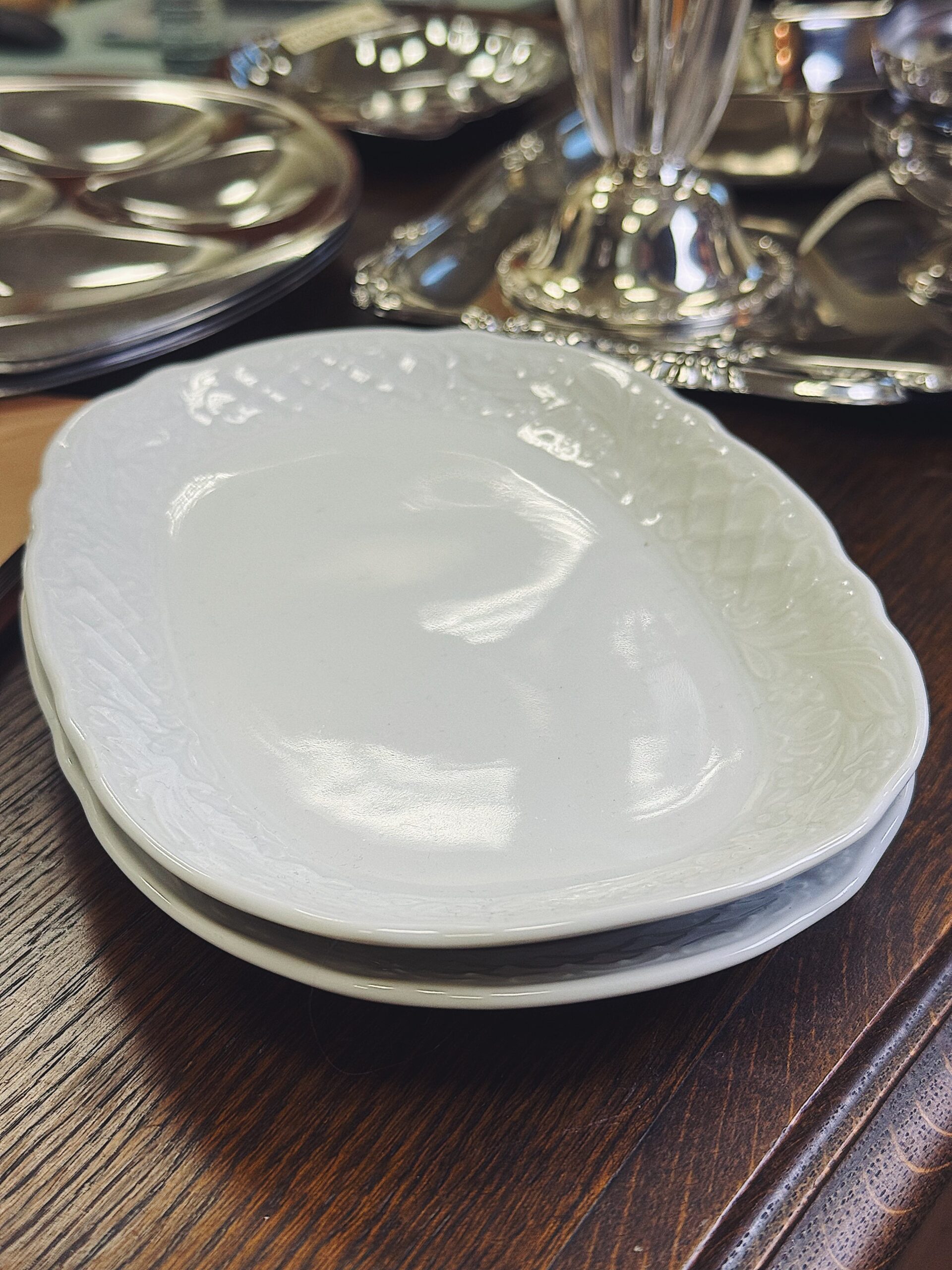 Lėkštutės ovalios formos, subtiliai dekoruotos reljefiniu ornamentu kraštuose, klasikinės baltos spalvos